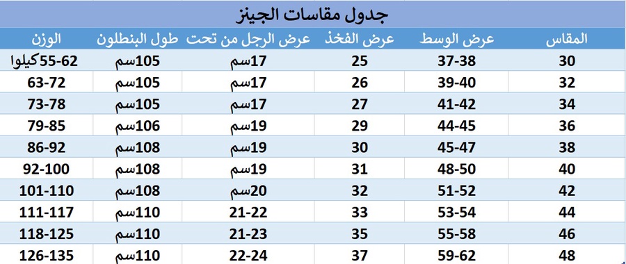 المقاسات: من 30 حتى 48