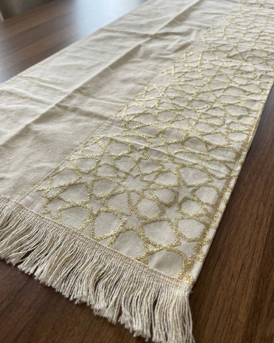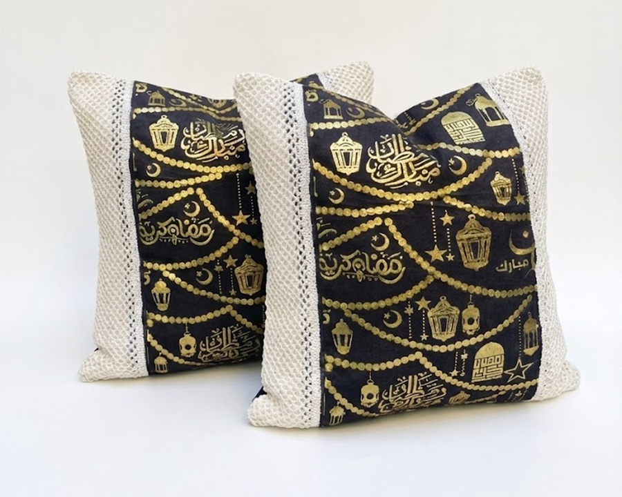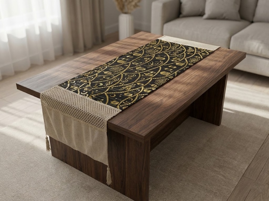جددي ديكور بيتك ولمّة رمضان بتفصيلة بسيطة لكن تأثيرها كبير مع طقم رانر الطاولة مع 2 كفر كوشن بتصميم رمضاني راقٍ يجمع بين الأناقة والهدوء. ألوان الأسود والبيج مع تطريز ذهبي فاخر تضيف لمسة فخامة تليق بالعزومات والضيافة، وتنسجم بسهولة مع مختلف أنماط الديكور العصري والشرقي.