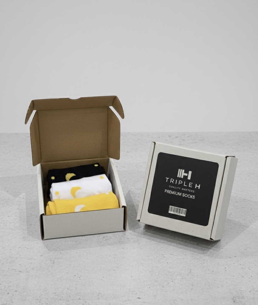 باكيت واحد فيه 3 قطع بألوان أساسية ثابتة تناسب كل لبسك: أسود – أبيض – أصفر.