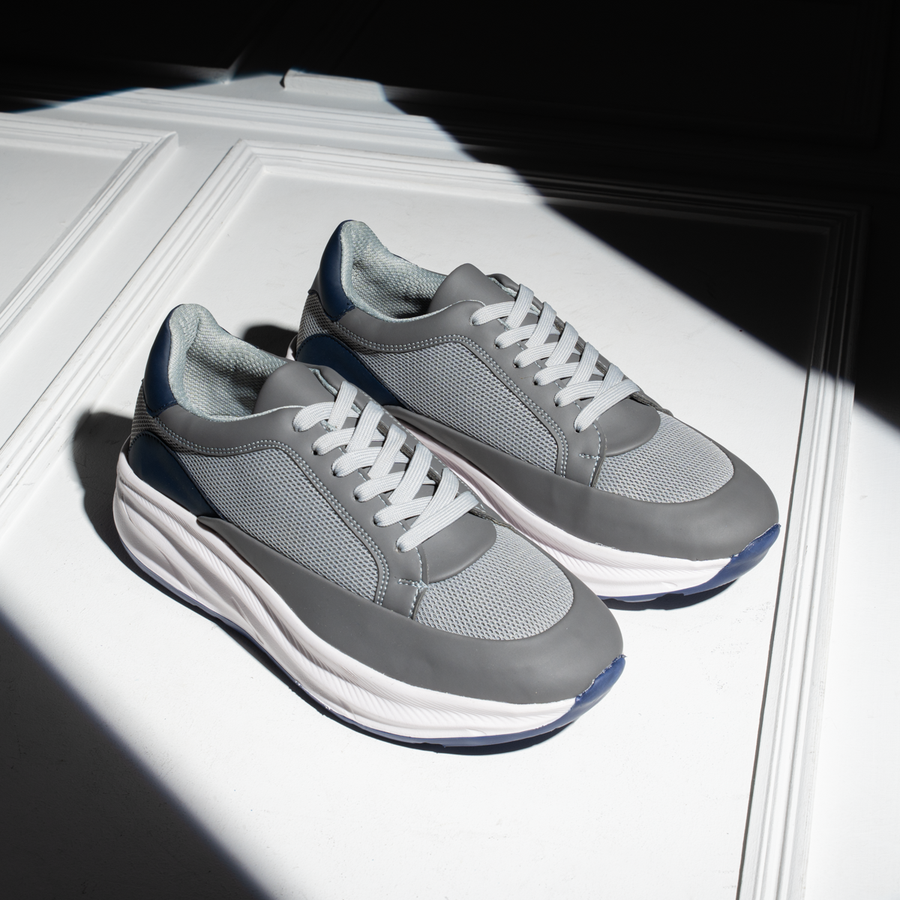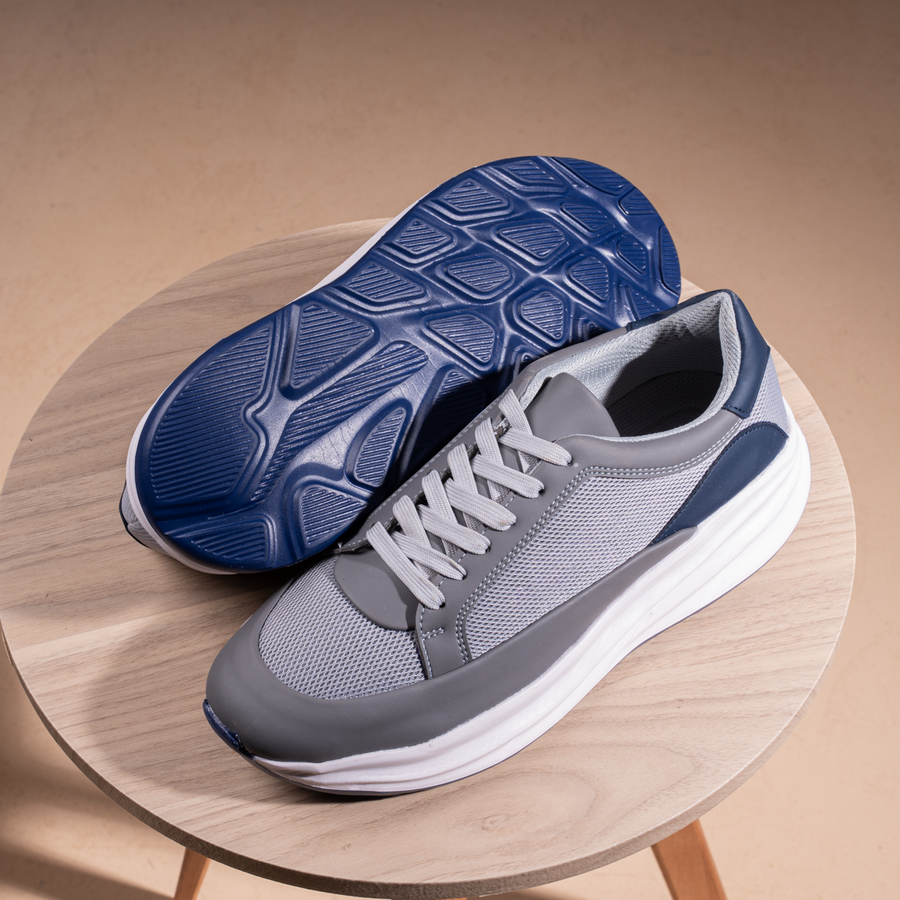 - تصميم أنيق ومتناسق: مزيج رمادي × كحلي مع نعل أبيض يعطي مظهر شبابي عصري يناسب كل ستايل.