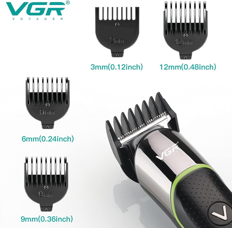 ماكينة الحلاقة VGR تمنحك تدرجات مختلفة لحلاقة الشعر، حيث يأتي معها 4 أمشاط بمقاسات مختلفة (12-9-6-3 مم).
