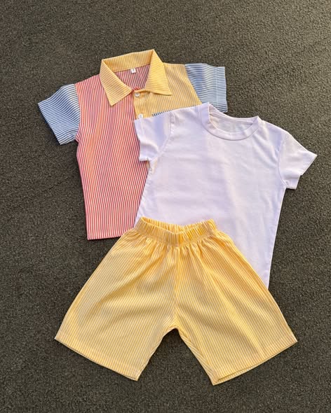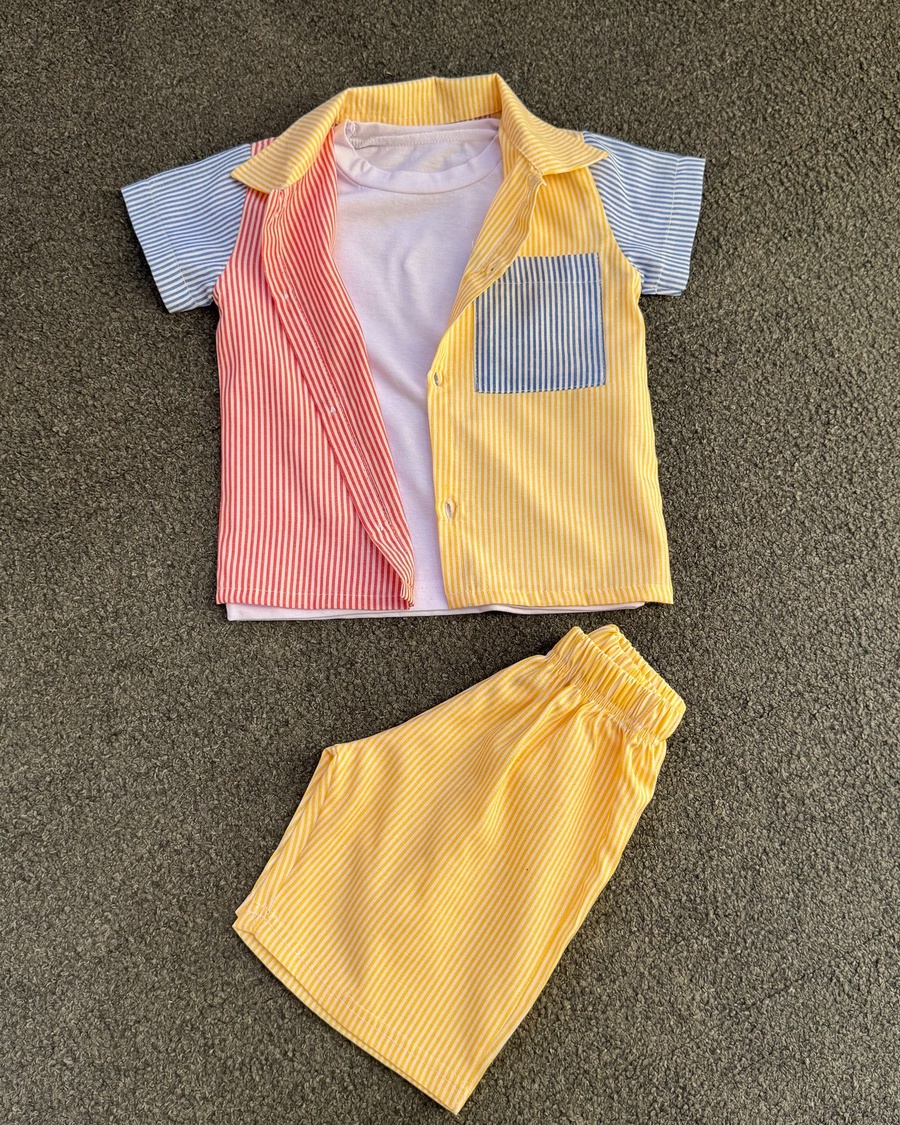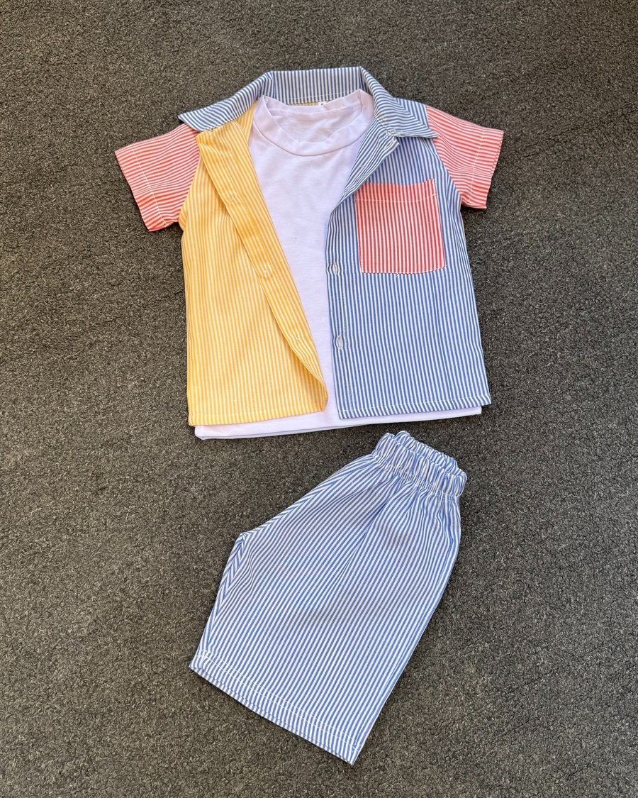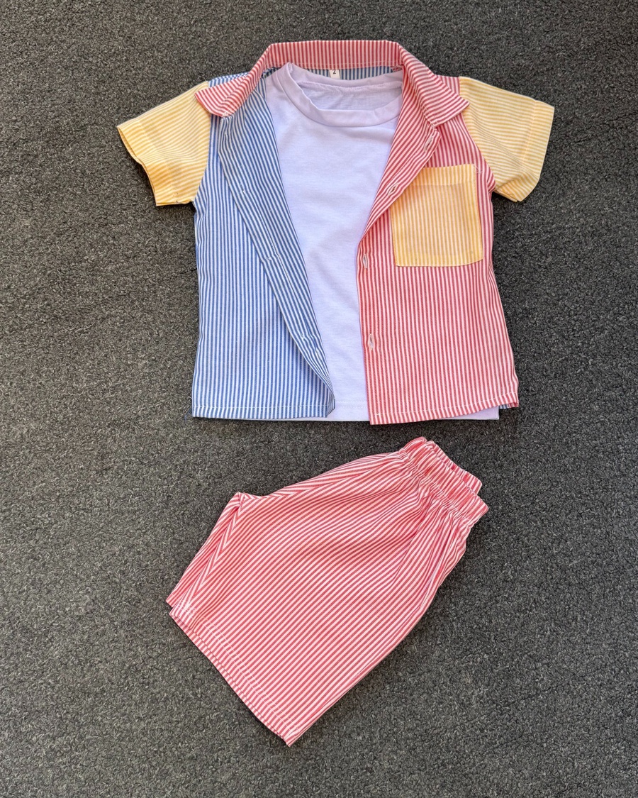 طقم أطفال مكوّن من قميص، شورت، وتيشيرت بيزك، بتصميم عصري وألوان تريندي تضيف لمسة من الحيوية والمرح على إطلالة طفلك.
